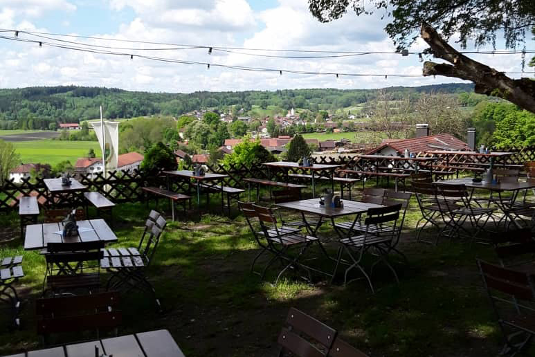Hoch über dem Moosachtal im Landkreis Ebersberg liegt unser Wirtsgarten unter alten Kastanienbäumen – mit weitem Blick bis zu den Alpen.